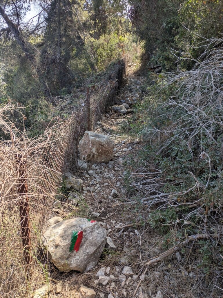 אחרי כחצי קילומטר נראה את סימון השבילים על המדרכה שמורה לנו לפנות ימינה לצידו השני של הכביש, שם אין מדרכה ואין הרבה מקום להתאסף אם מטייליים בקבוצה גדולה. נחצה בזהירות את הכביש וניכנס אל החלק המאתגר ביותר במקטע הרביעי של שביל ואדיות חיפה.